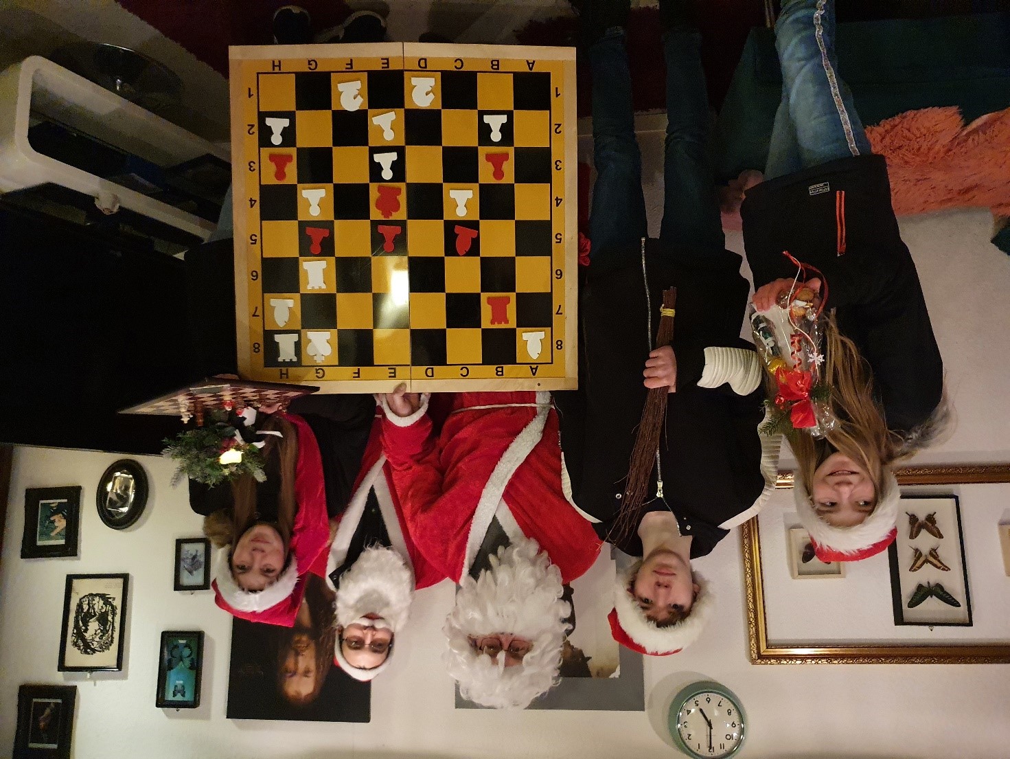 Schach bei Merkur... Hallo zusammen! „Corona ist schei.., und der daraus resultierende Lockdown erst recht“ hörte ich letztens von einem Schachfreund. Aber davon lässt sich der SV Merkur Hademarschen ganz sicher nicht kleinkriegen, sondern macht aus den Möglichkeiten das Beste. So wie wir zwischen Juni und Oktober unter Auflagen den Spielbetrieb wieder aufgenommen und sogar zwei 15min-Schnellschachturniere durchgeführt haben, so gab es in der Schachsparte auch im aktuellen Lockdown eine Art „Trotzreaktion“. Getreu dem Motto: „Könnt Ihr nicht zum Verein kommen - dann kommt der Verein zu Euch!“ fand es sich, dass ALLE Mitglieder des SV Merkur Hademarschen im Dezember Besuch vom Weihnachtsmann erhielten. Dieser hatte noch seinen siamesischen Zwilling und drei Wichtel im Gepäck... (siehe Foto)