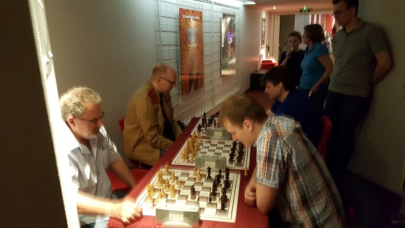 Vor Ort trafen sich dann, neben den Mitgliedern des Filmklubs, etliche Schachbegeisterte und spielten die eine oder andere Partie. Wenn es auch um die schachlichen Kenntnisse einiger Besucher nicht so gut stand „Bei euch gibt’s doch keinen Elfmeter? Aber Abseits habt ihr doch oder?“, so konnte doch jeder, spätestens nach der Filmvorführung, die Faszination Schach verstehen.