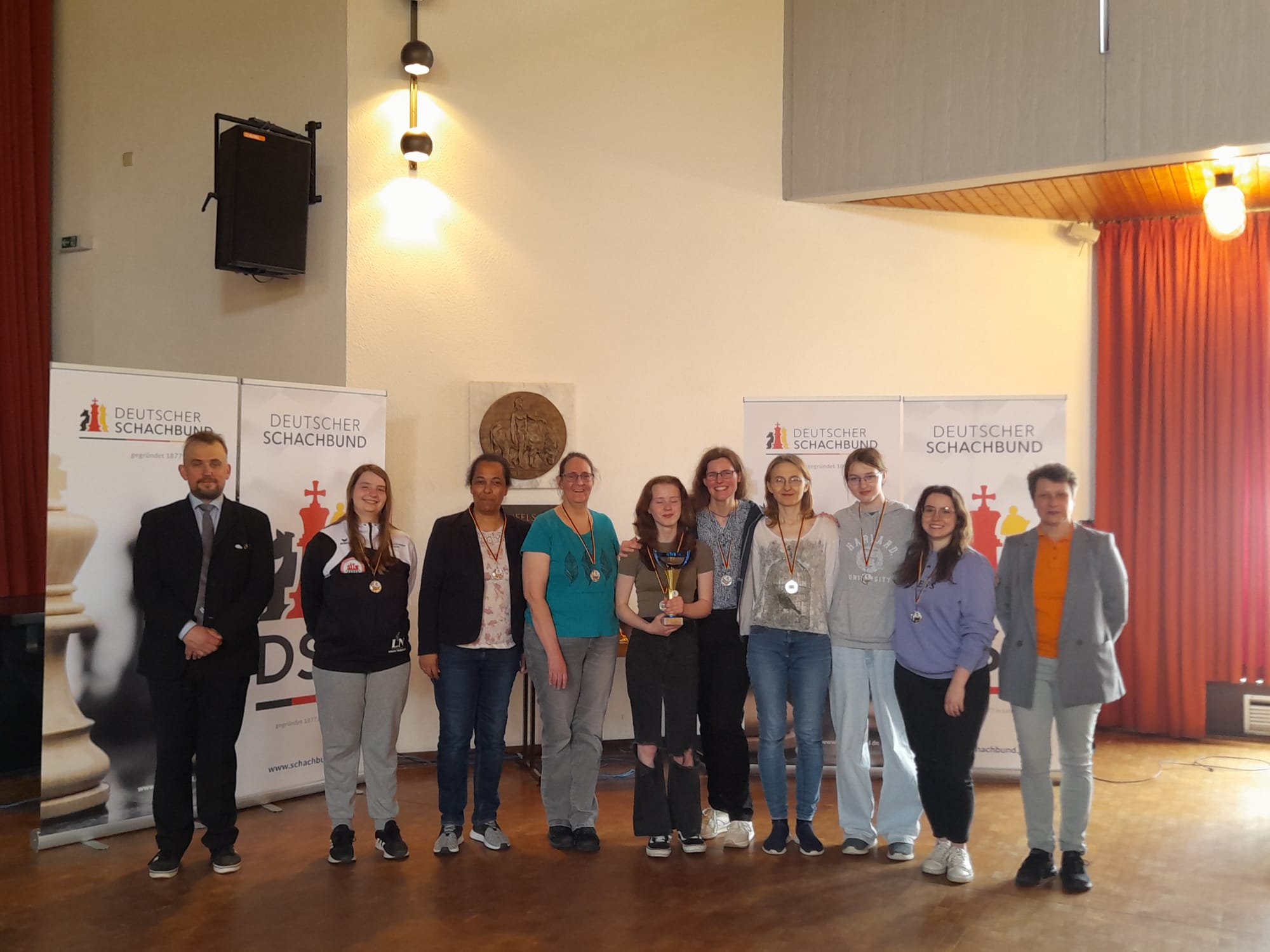 Nach dem klaren Auftaktsieg gegen Bayern 2 folgte eine ebenso klare Niederlage gegen die bayrische Erstvertretung und späteren deutschen Meisterinnen aus unserem südlichsten Bundesland. Dass jedoch auch im Norden gutes Schach gespielt wird, wurde mit zwei weiteren klaren Siegen gegen Hamburg mit 6 : 2 und gegen Hessen 1 mit 7 : 1 deutlich. In der Schlussrunde traten wir gegen die deutschen Meisterinnen aus dem Vorjahr aus NRW an. Da Bayern 1 und NRW sich am Vortag Unentschieden getrennt hatten, war sowohl die deutsche Meisterschaft als auch ein Abrutschen ins Mittelfeld möglich. Ein wenig überraschend entwickelte sich ein spannendes Duell auf Augenhöhe, war doch NRW (ELO 2028) klarer Favorit gegenüber Schleswig-Holstein (ELO 1949). Beim Stand von 2,5 : 2,5 ging ich zum Mittagessen und als ich wiederkam stand es 4,5 : 3,5 für Schleswig-Holstein. Welch ein Erfolg! Auf die restlichen Einzelergebnisse geschaut wurde schnell klar, dass ausgerechnet unser Küken WFM Lisa Sickmann sich den „Big Fisch“ geangelt hatte, indem sie WGM Carmen Voicu-Jagodzinsky (ELO 2228) geschlagen hatte. Dies soll keinesfalls die Leistung aller anderen Mannschaftskolleginnen schmälern, haben doch fast alle Spielerinnen ein ELO-Plus erspielt. Am erfolgreichsten war dabei Katarina Bräutigam, die mit 4 aus 5 eine Performance von ELO 2255 erzielte, was ihr einen Zuwachs von 65 Punkten einbrachte, sogar noch vor Lisa, die „nur“ 40 Punkte dazugewann und Alexandra Mundt mit + 28 ELO. Unterm Strich standen für die Mannschaft insgesamt fast 150 ELO-Punkte mehr auf der Habenseite, welches diesen außergewöhnlichen Erfolg nochmals unterstreicht.