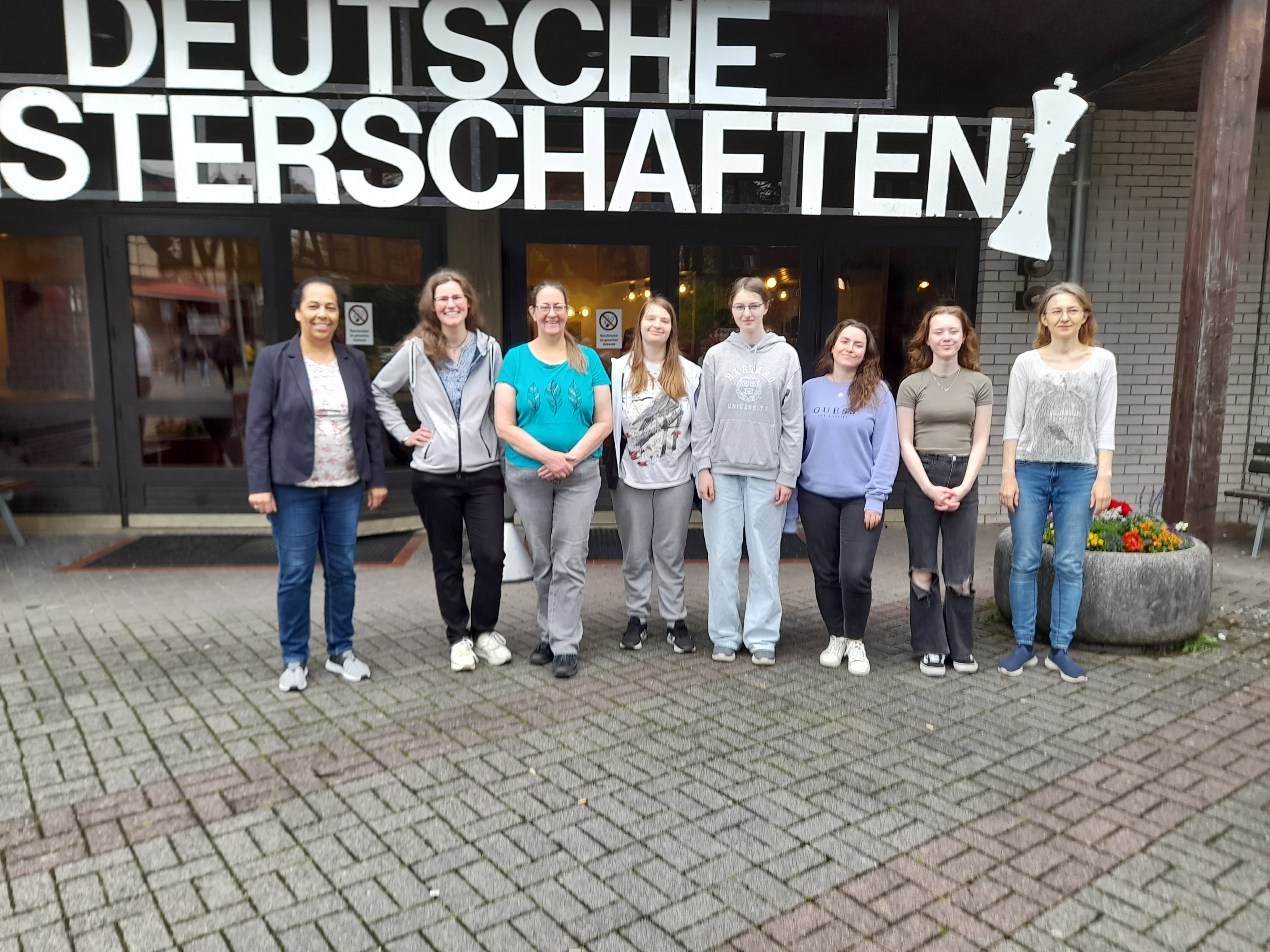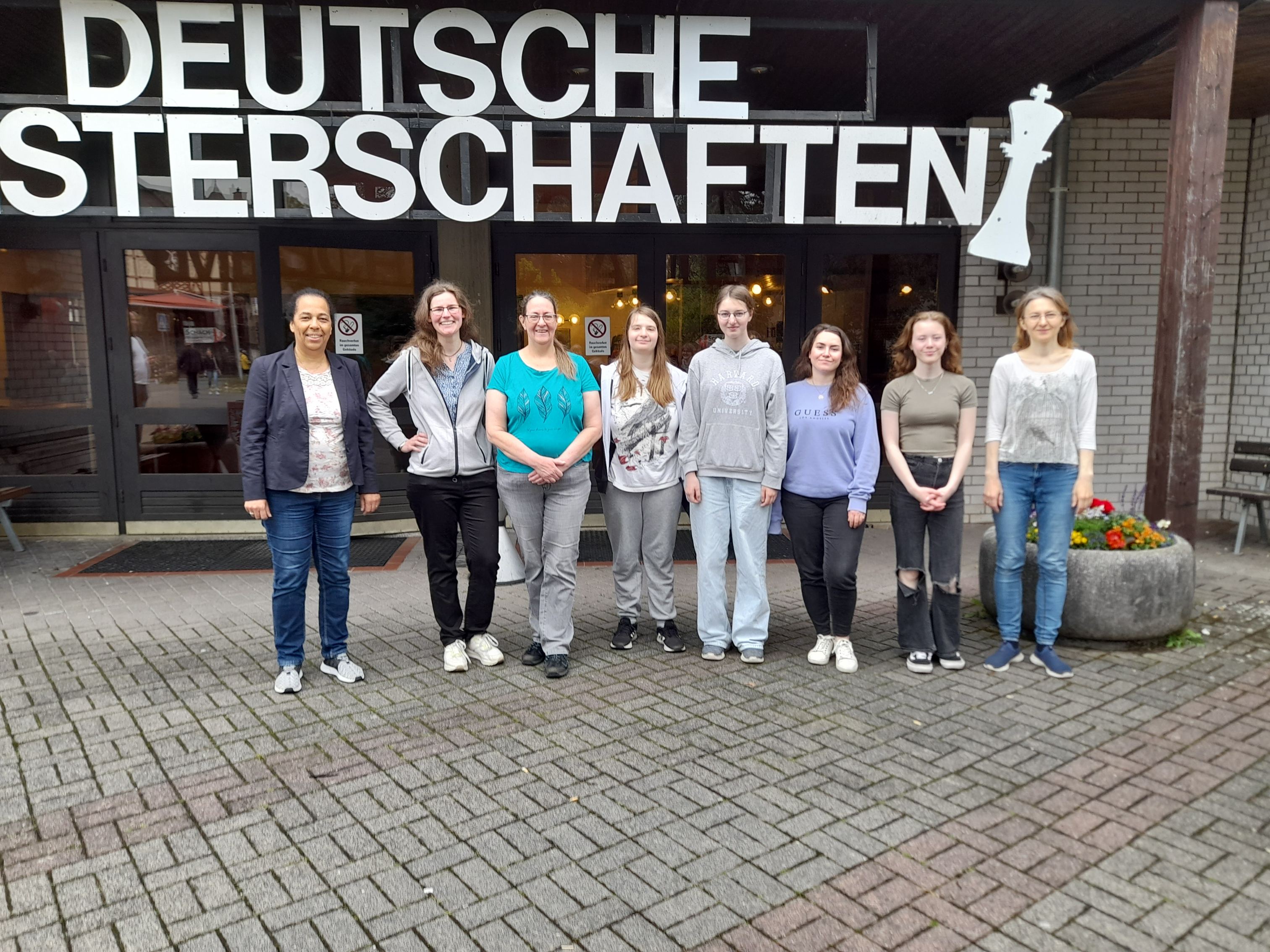 Erstmals war Lisa dabei, die gerade den WFM-Titel verliehen bekommen hatte. Anke übernahm zum ersten Mal das Amt der Mannschaftsführerin. Sie und Irina fuhren die Autos, Emily kam per Bahn aus Berlin nach Braunfels. Hanna Greßmann wurde leider kurzfristig krank und drückte uns aus der Ferne die Daumen, so dass mein geplanter Ersatzspielereinsatz zum Volleinsatz wurde. Wir waren in der Startrangliste an Nummer 4 von 14 Teams aus 12 Landesverbänden gesetzt. Bayern und Hessen nahmen mit je 2 Teams teil. Außerdem gab es 2 Spielgemeinschaften, die für Nichteingeweihte nicht als solche erkennbar waren (Saarland und Baden-Württemberg), d.h. diese Mannschaften können den Titel nicht erhalten, sofern sie auf Platz 1 einkommen.