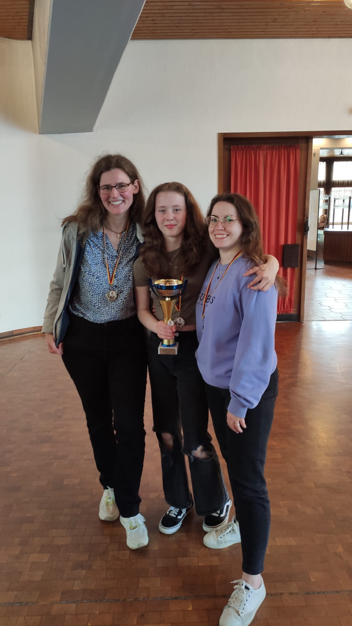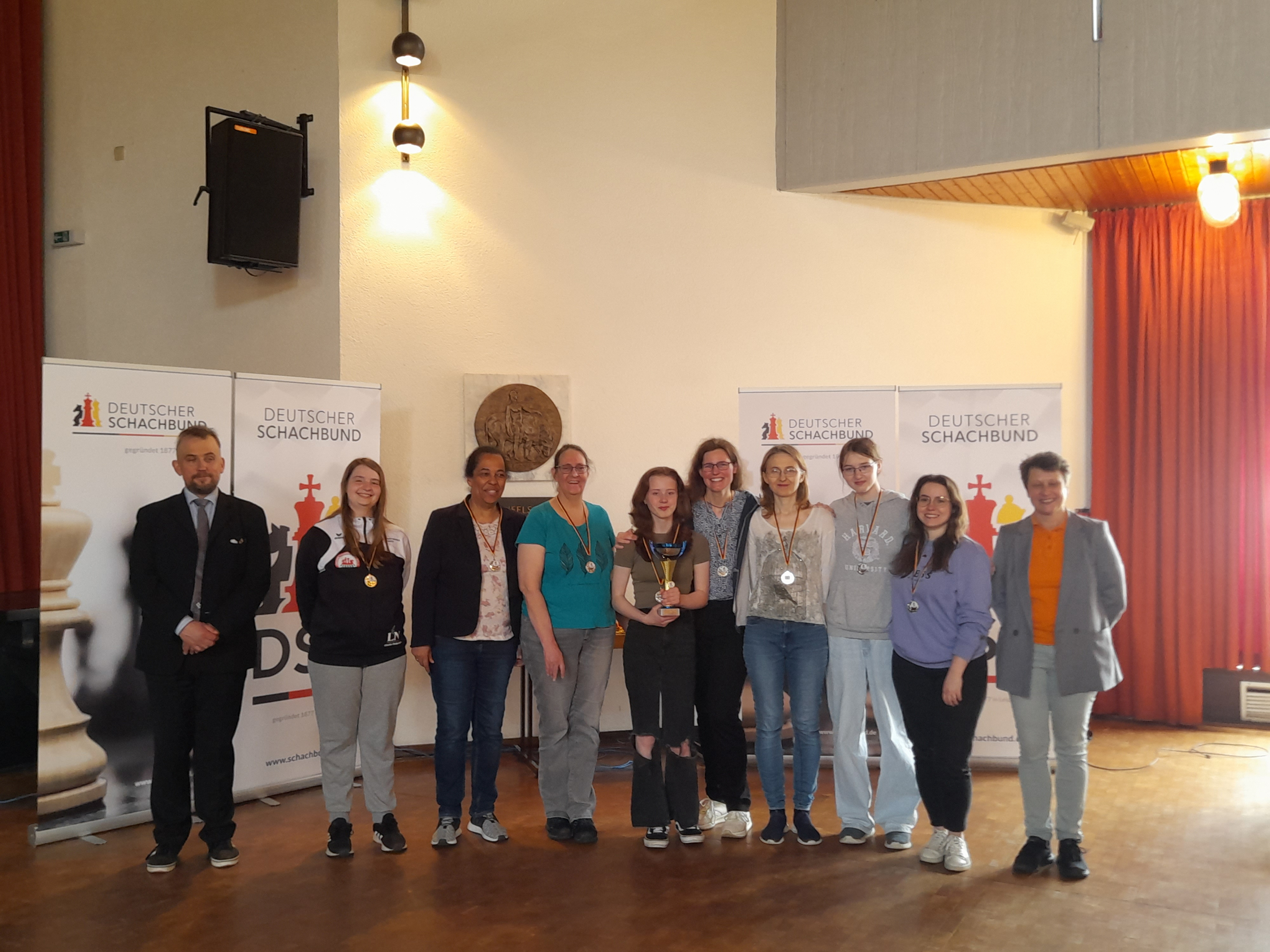 Als ich als Erste ein Remisangebot erhielt, stand Emily auf Gewinn (Qualität mehr und klarer Entwicklungsvorteil), 2 weitere Spielerinnen standen sehr gut und beim Rest war alles im Gleichgewicht. Es sah also ganz gut aus. Nach 2 weiteren Stunden wurde aus den 3 o.g. Spielen 2 Remis und ein Spiel mit einer Qualität weniger. Der Wettkampf kippte zugunsten NRWs und die Miene des NRW-Mannschaftsführers, Ehemann der Spielerin an Brett 1 (WGM Carmen Voicu-Jagodzinsky), erhellte sich zunehmend. Beim Stand von 3:3 kämpften noch unsere beiden Spitzenbretter. Während Inken an Brett 2 die Qualität zurück erobern konnte und ein Remis sicherte, blickten alle auf Lisas Brett, das von einer Zuschauertraube umringt war. Lisa hatte sich inzwischen eine Gewinnstellung erarbeitet. Aber jeder weiß nur zu gut, dass das nicht immer mit einem Gewinn gleichzusetzen ist. So musste sie z.B. aufpassen, dass ihre Gegnerin nicht ihre letzten beiden Leichtfiguren gegen Lisas verbundene Freibauern opfert, denn bekanntlich kann man mit 2 Springern nicht gewinnen. Lisa spielte ruhig und konzentriert weiter. Als Carmen ihr die Hand zum Sieg reichte, war unsere Freude riesengroß. Das war der erste Sieg gegen NRW verbunden mit dem 2. Platz bei dieser Meisterschaft. NRW wurde Dritter.